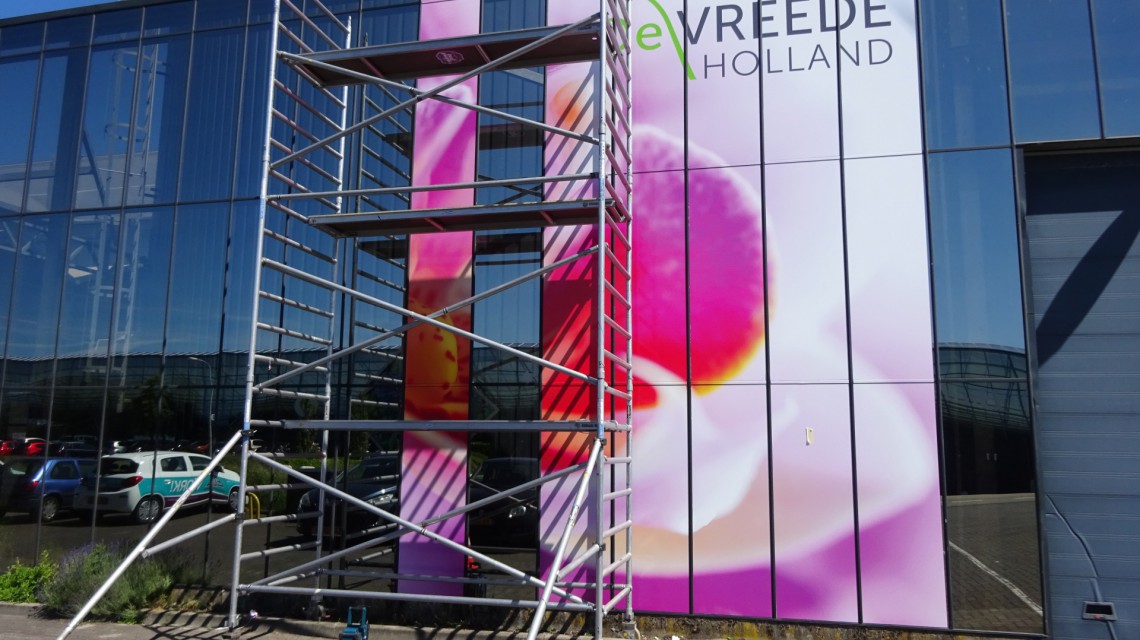 We hebben bij drie locaties van phalaenopsiskweker De Vreede Holland in Bleiswijk de gevel mogen voorzien van een XXL print, variërend in grote van 700 x 650 cm tot 820 x 790 cm. De print komt ook terug op de voertuigen van De Vreede Holland, waardoor dit zorgt voor extra herkenning en een uniforme uitstraling.