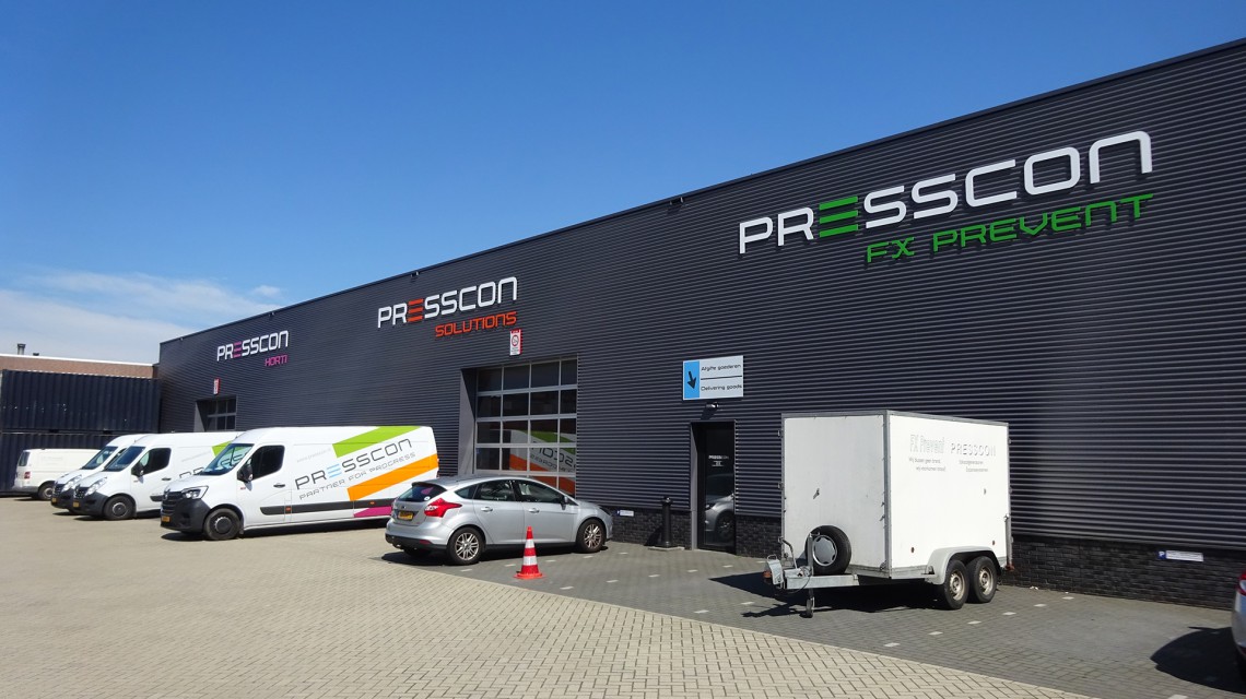 Aan de voorgevel hebben we een paneel van 800x150cm gemonteerd met daarop indirect verlichte doosletters. De letters PRESSCON hebben 's-nachts een witte gloed, PARTNER een roze, FOR een oranje en PROGRESS een groene. Hiermee worden de diverse subdivisies binnen Presscon weergegeven.