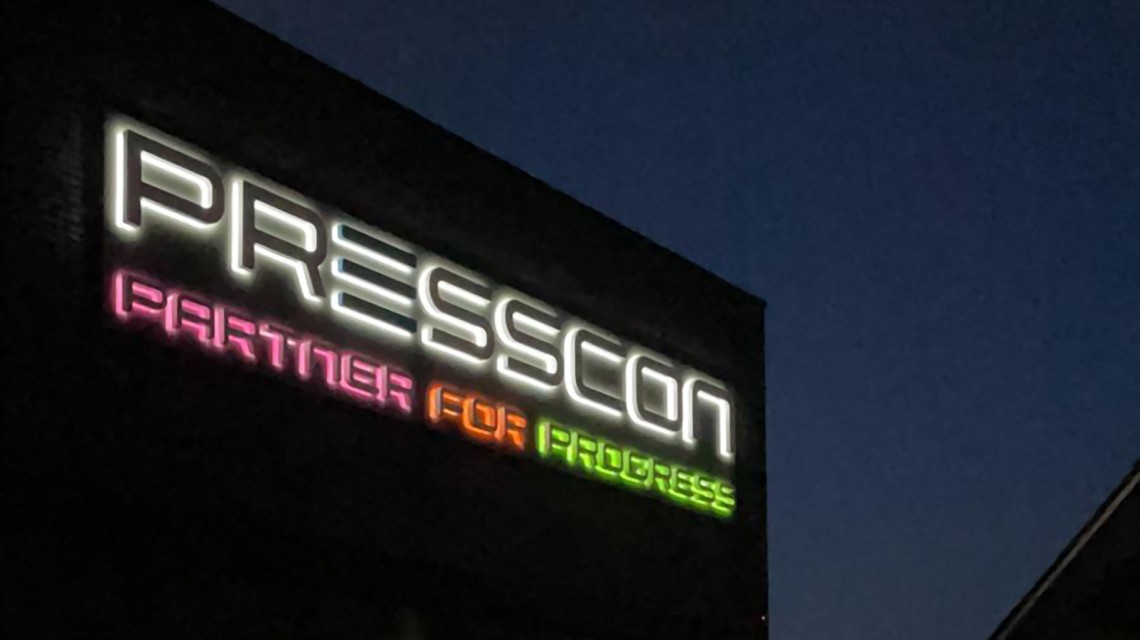 Aan de voorgevel hebben we een paneel van 800x150cm gemonteerd met daarop indirect verlichte doosletters. De letters PRESSCON hebben 's-nachts een witte gloed, PARTNER een roze, FOR een oranje en PROGRESS een groene. Hiermee worden de diverse subdivisies binnen Presscon weergegeven.